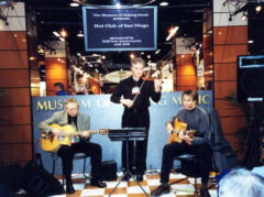 The group, Primasi, was a collection of high-level classically trained musicians that Vitas fit in comfortably with. “That was guitarist George Svoboda’s group…we played a variety of tunes in 7/4 and 5/4 time,” he recalled. “It was a really good experience and I enjoyed that.” In 1995, the Cool Club Quartet and the Hot Club of San Diego groups threw Vitas into the Gypsy jazz limelight, where he got to showcase his jazz chops in tandem with guitarists in each setting, à la Stephane Grappelli and Django Reinhardt. The Cool Club quartet’s guitarist was the late Art Johnson, who he cites as helping him learn how to play stylistically in that genre. “We did a concert at the Horton Grand,” Vitas recalled, “that brought the concert’s producer, Holly Hofmann, to tears during our performance.” That group morphed into the Hot Club of San Diego after Johnson moved abroad and was replaced by guitarist Patrick Berrogain. “It was so much fun playing that music,” he stated, “having studied many of violinist Grappelli’s solos.” In an appearance at the annual NAMM (National Association of Music Merchants) show in Anaheim, Vitas got to play and purchase the aforementioned Steinberger CR5 violin, which he used to perform with that day.