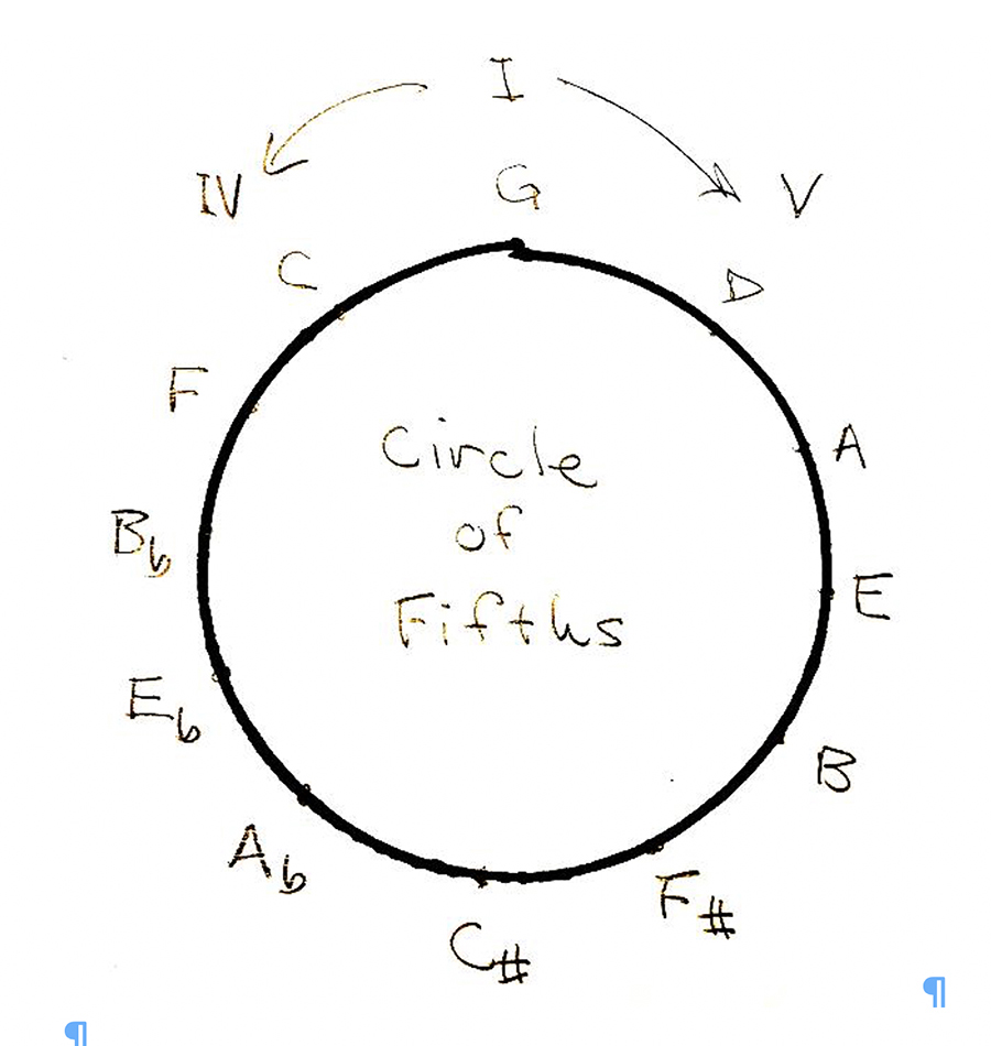 If you’ve played or studied music for a while, you might recognize this as a circle of fifths (or circle of fourths) progression. Let’s digress on that for a minute. If you want more on this subject, there is a wealth of online discussion, a lot of it using words not in my vocabulary. Simply, “I” (the “one” chord) represents the tonic, or key of the song, in this case G. If we go to the fifth note of the G scale and take the resulting chord, “V,” it is D. The V chord of D is A, and the V of A is E. If we continue this process, we eventually get back to G, having traversed all of the chords based on the 12 tones we use in our music. The cycle of fifths!