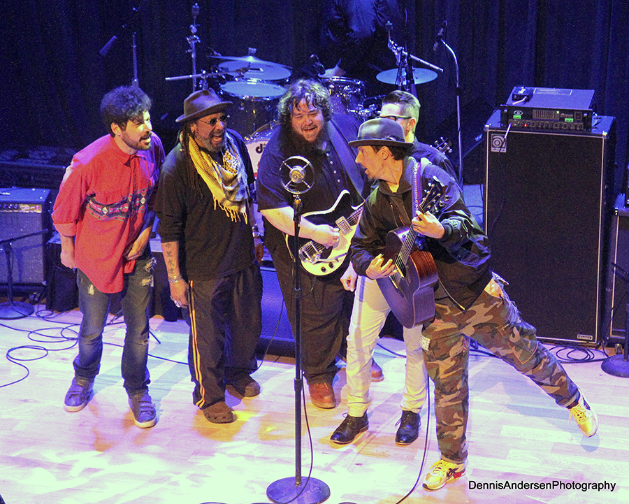 Java Joe All-Stars at the 2018 San Diego Music Awards when Joe won Lifetime Achievement Award (Billy Galewood, Toca Rivera, Jeff Berkley, Veronica May, Jason Mraz). Photo by Dennis Andersen.