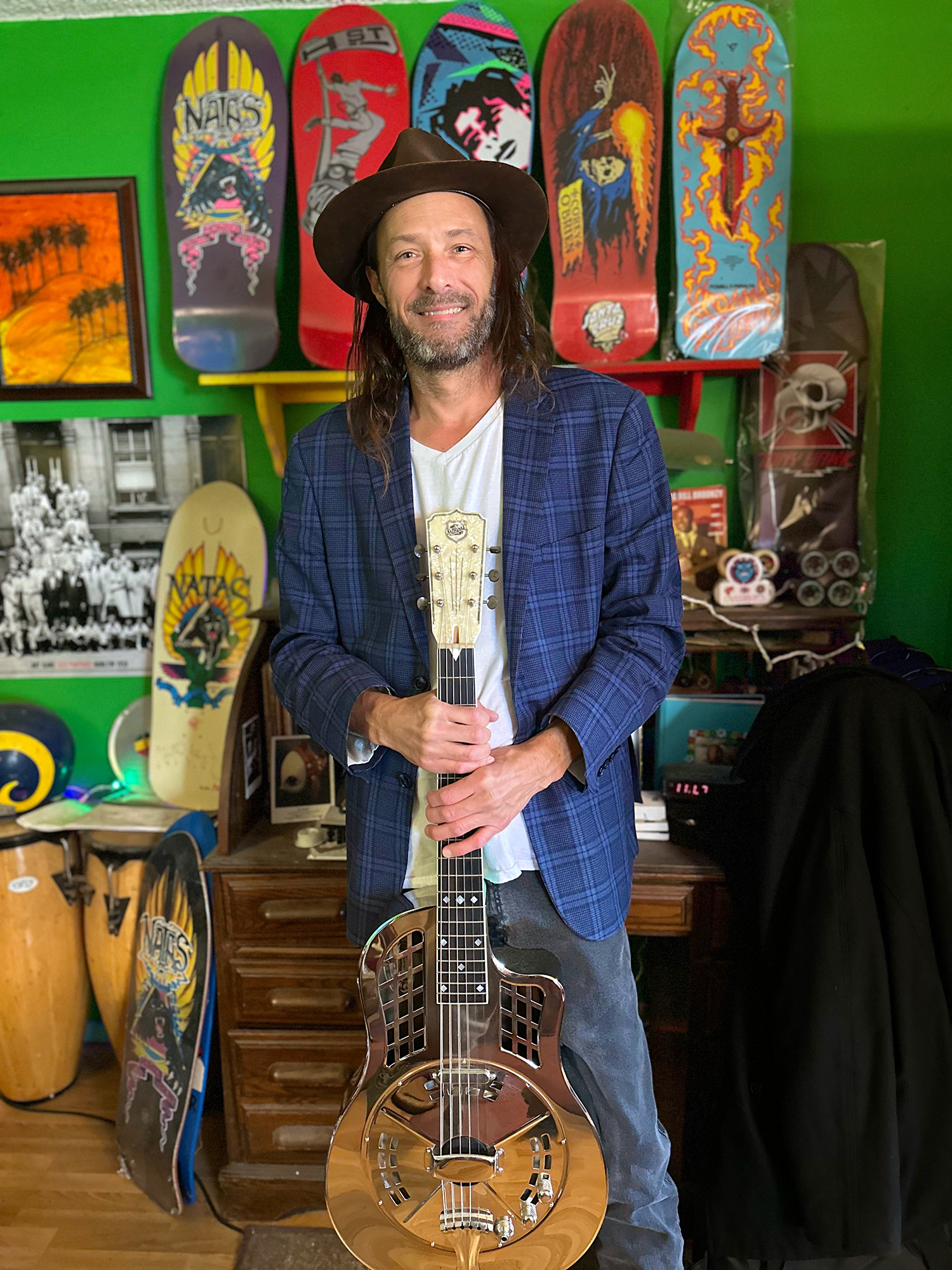 Musically, I can tell you about the blues and roots music, early jazz, ragtime, and all that stuff; Delta, Hawaiian, early country, Appalachian fiddle tunes, which eventually matriculated into America. Whether it’s direct or indirect we have a hell of a deep well to draw from…and I’m a beneficiary of that. I don’t invent anything but after doing it for 20 or 30 years now, hopefully I [air quotes] get to invent my sound, but it is 100% evolved from American roots music. And not just one type, but many types. I feel hyper aware that we have that deep well of music to draw from. Not only the guys we mentioned but so many others…Piedmont style, Delta blues, Texas blues—honestly so much stuff. Even in California we have our own great history, but my main influence musically is from the South. I compose in different styles and that’s super fun now that I’m a little more mature musically; I’m not just flying by the seat of my pants or going off of pure inspiration. I can actually think about something like, you know, I want to write a honky-tonk record and I can draw from those great players and great songs. I’m just being more aware of what I’m doing. When you first start there is no self-awareness and if there was…I probably wouldn’t have done it. When you’re getting started, if you were to think about what you’re doing, you probably wouldn’t do it. I’m going to jump up there and entertain people…luckily, I didn’t think too much about it and just did it.