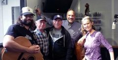 Wayne Rice, DJ at KSON, in the studio with Prairie Sky as part of his program, bringing live local bluegrass bands to the radio.