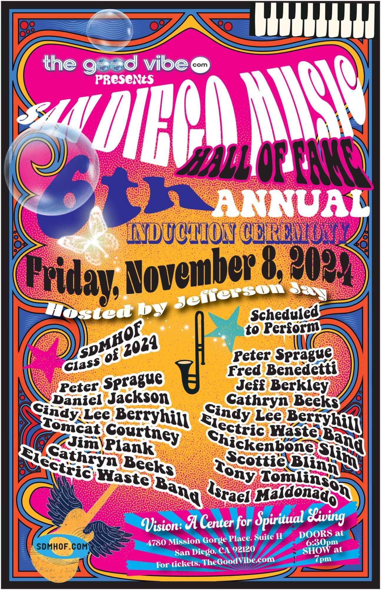 The sixth annual San Diego Music Hall Of Fame Induction Ceremony takes place on November 8, from 6 to 10pm at VISION: A Center for Spiritual Living. For more information and tickets, go to: https://www.eventbrite.com/e/san-diego-music-hall-of-fame-6th-annual-induction-ceremony-tickets-951270374297