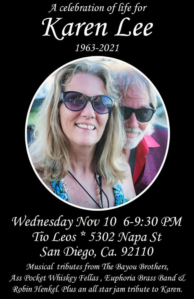 Friend, brother, longtime drummer, San Diego County native, and Bayou Brothers band founder Ric Lee lost the love of his life Karen on Sept 28, due to a severe aneurysm suffered just two days after celebrating their 20th anniversary. Many of us in the music community knew Karen, a bright, friendly, sparkplug of a gal with a wicked sense of humor that was often a fixture at Bayou Brothers events.