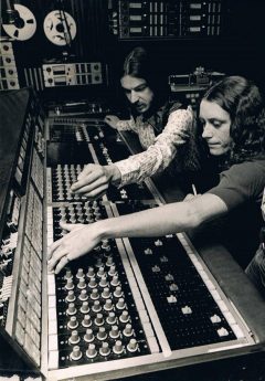 Chris Faust, right, at the mixing board, 1972, at Inter Media Sounds in Boston.
