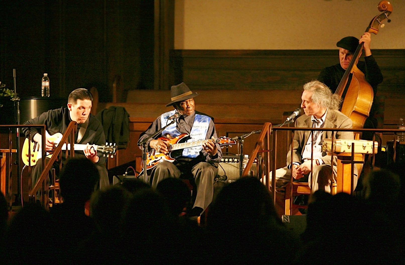 Chris & Patrick on stage with Honeyboy Edwards & Michael Frank. Photo: Bengt Nyman.