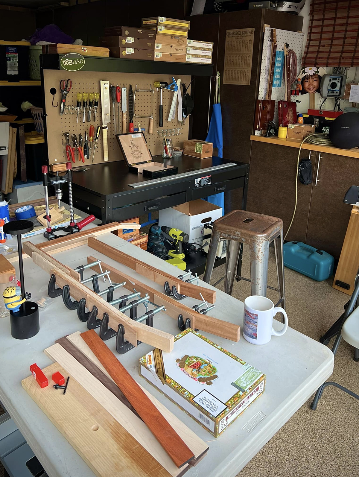 When I’m working on these things, days on end, mornings and through the afternoon, I’m in the garage. In the background I’m playing music like Lightnin’ Hopkins and artists that I’ve heard of but not too familiar with who lived at the turn of the century; I’ll listen to album after album. I’m marinating in it as I hammer in the frets or on the drill press; I absorb all of this by osmosis. Has it helped my playing? Absolutely! Blues is all about a feel…and emotion. I subscribe to the fact that it’s not about how many notes you play or how fast you play. It’s how you play those notes. So, building cigar box guitars coupled with the music I’m soaking in, sprinkled with all these friends that I have, whom I admire, it all folds into my limited musicianship. I think it gives me a heightened appreciation of music and the blues, specifically. It helps me understand it at a different level.