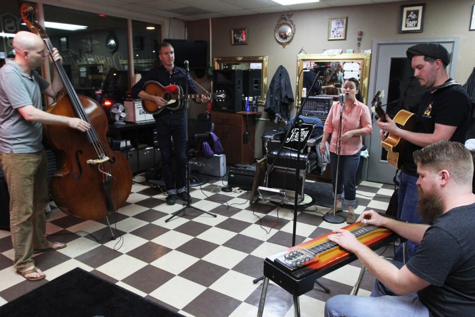 Every bunch of cool kids should have a clubhouse, and the FAB clubhouse is Dapper Jay’s Barber Shop & Hot Shaves in La Mesa. This is the after-hours hangout and practice location, and where the band does most of its video and photo shoots. The retro vibe provides a perfect atmosphere. There are gilded mirrors, a checkerboard tile floor, and, of course, big swivel chairs. The smell of aftershave carries out to the sidewalk, and clippers, razors, and genuine butch wax are kept at the ready. Hank Williams and Johnny Cash (the iconic middle finger shot) look down from the walls to keep things honest, and a fridge of cold Millers keeps things loose. “Just like home!” say Fanny.