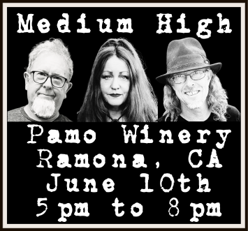 June 10th – The debut of MEDIUM HIGH the new trio featuring the Reverend Stickman, Chuck Roberts and Cathryn Beeks. Covers, originals, fun! Pamo Winery No cover 5pm to 8pm