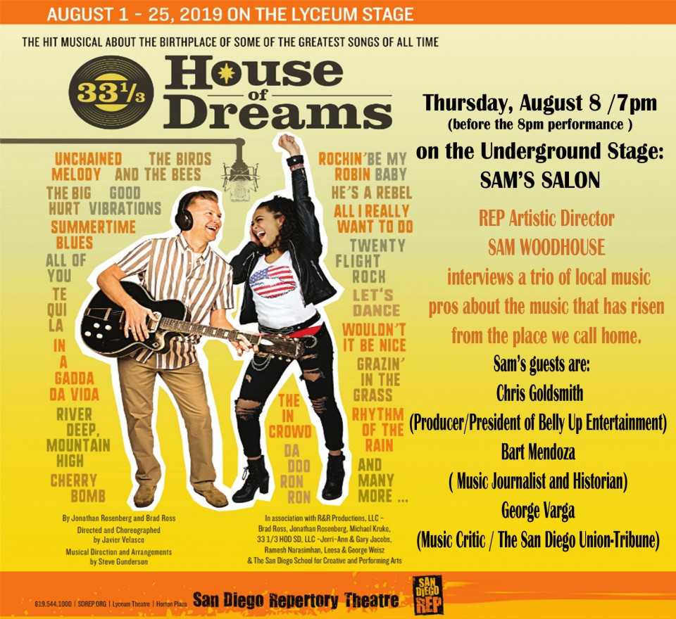 Presented for this initial run of shows by the San Diego Repertory Theatre at the Lyceum Theatre, House of Dreams 33 1/3 covers decades of music history. It’s an immensely enjoyable show, which left me wanting more— the story hinted at many more happenings that took place there. My friends and I would have gladly sat through another hour of scenes.