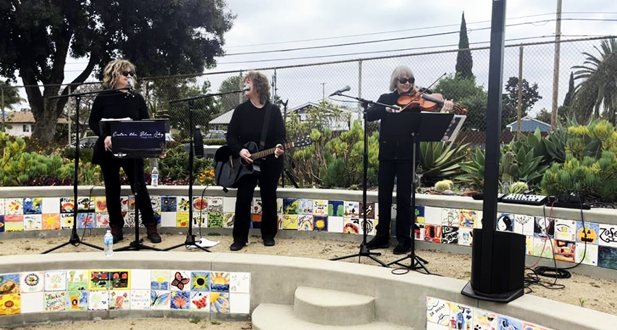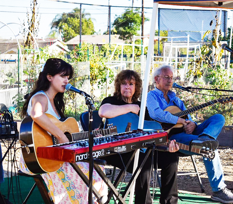 Thea Tochihara, Sandé Lollis, and Mark Montijo perform at the Community Garden.