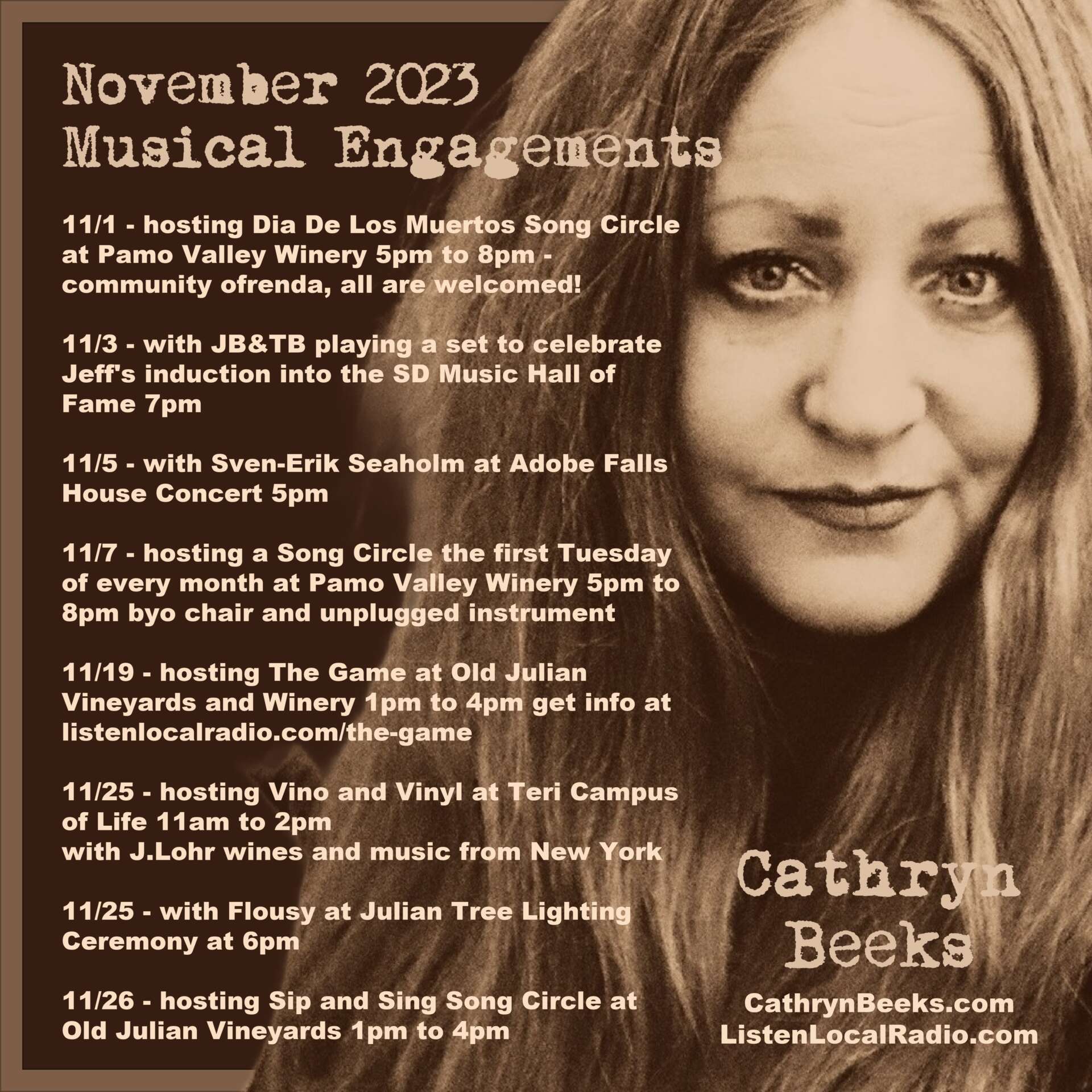 Hi! Late again. Sheesh. Sorry, pals. Ok, real talk. I don’t have anything interesting to talk about this month. I’ve shared with you, on the poster below, all of the shows I’ll be hosting or playing this month and the podcast is posted and overflowing with great songs by great folks. I’m taking few weeks off this month to work on a stop motion animated film and book called 3 Sad Goats, a short children’s story that my grandfather, Bevery Beeks, wrote in the 1930s and I just recently discovered. So, I leave you with my sincere hope that your November is full of great music, memorable moments, creative awakenings and lots and lots of love. xo Cathryn