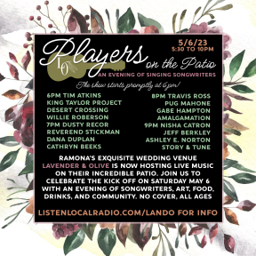 May 6th we’re kicking off live music at Lavender & Olive in Ramona with an “acoustic alliance” style, in the round showcase of some of the best singing songwriters on the most stunning patio, ever! The owners of this incredible place have been hosting weddings and are now eager to share what they’ve built with our music community, too. Just WAIT until you behold this remarkable place! We’ll have a mini art walk featuring Denise Bonaimo Sarram, Geeta Chinai, Linda Glassi and more plus food by The Pizza guys and bar service by Nutmeg Bakery and Cafe available. No cover, all ages, sorry no pets. See you there!