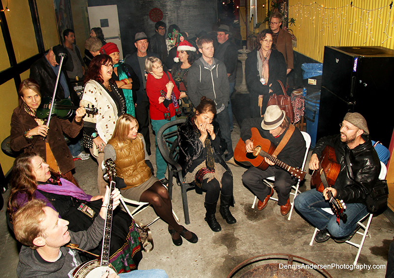 Troubadour jam in the outside patio, 2013. Photo by Dennis Andersen.