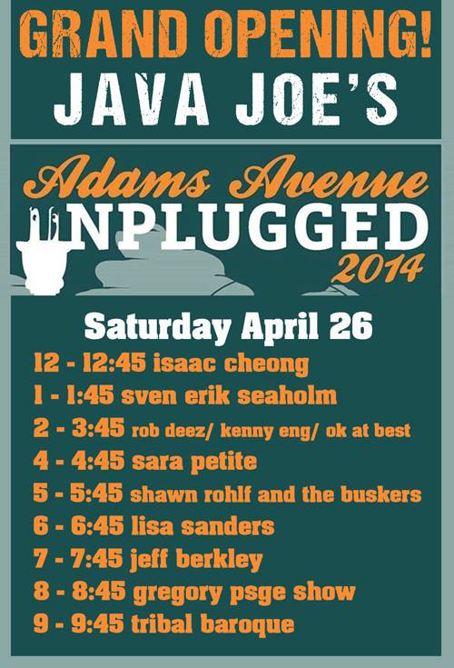 Saturday April 26th marks the grand opening of Joe Flamini’s new Java Joe’s in the artsy neighborhood of Normal Heights. The grand opening concert will coincide with the annual Adams Ave Unplugged Festival and will feature local favorites such as Lisa Sanders, Jeff Berkley, Gregory Page and more! Don’t forget to stop by and support one of local music’s biggest champions! For more info about Java Joe and his role in the San Diego music scene, visit www.javajoessd.com.