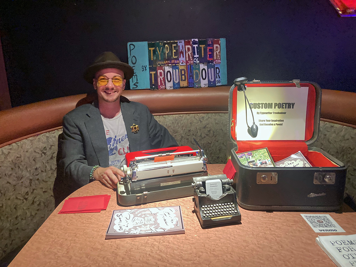 Describing hot water in a gas station bathroom as self-care may not sound like much. But being on the road and being a solo artist reframes the world. Little things mean a lot. And though he asked more established traveling poets for help in getting set up, most just said he had to find his own way. He now appreciates that. And he is pushing the Typewriter Troubadour brand toward an even better life.