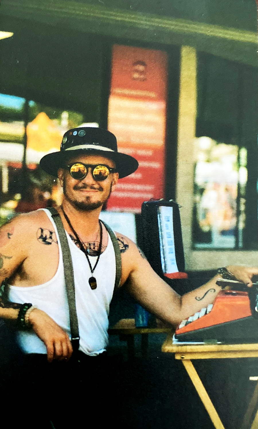 “I went in, and I met this woman who was there training people who were slam poets. We got to talking—she lived an avant-garde lifestyle and traveled. She suggested using my typewriter as a busker to make custom poems. One of her old boyfriends, Kevin Devaney, did that. She kind of inspired me with the idea, and since I had been playing music and grew up in the open mic scene in San Diego, I used to bring my guitar to busk in the ‘’90s. So, it wasn’t outside of the realm to busk with the typewriter.