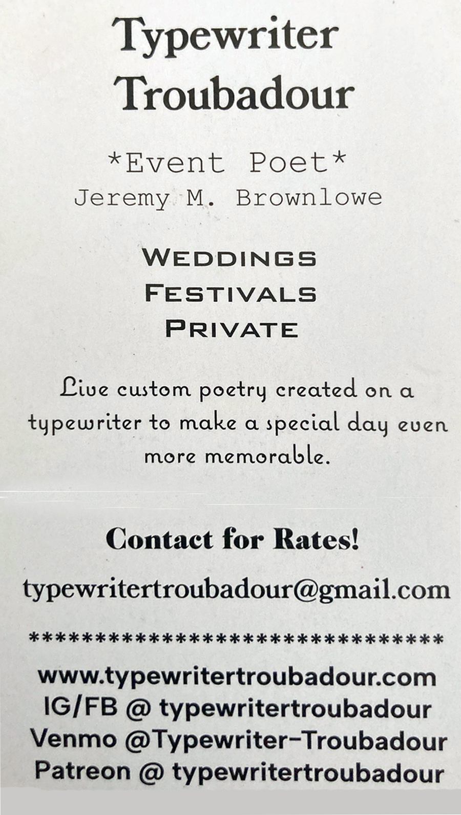 Jeremy Brownlowe, an energetic man who often wears a fedora and maybe a retro-looking bowtie, can be found in a corner of those markets creating on-the-go poetry for those lucky enough to find him. His moniker, the Typewriter Troubadour (typewritertroubadour.com), describes what he does: he takes a prompt, a word, phrase, or topic from a curious passerby, and, on his olive-green Smith-Corona, he creates on the spot. He composes bespoke poems for your enjoyment, on your chosen topic, and he does it quickly.