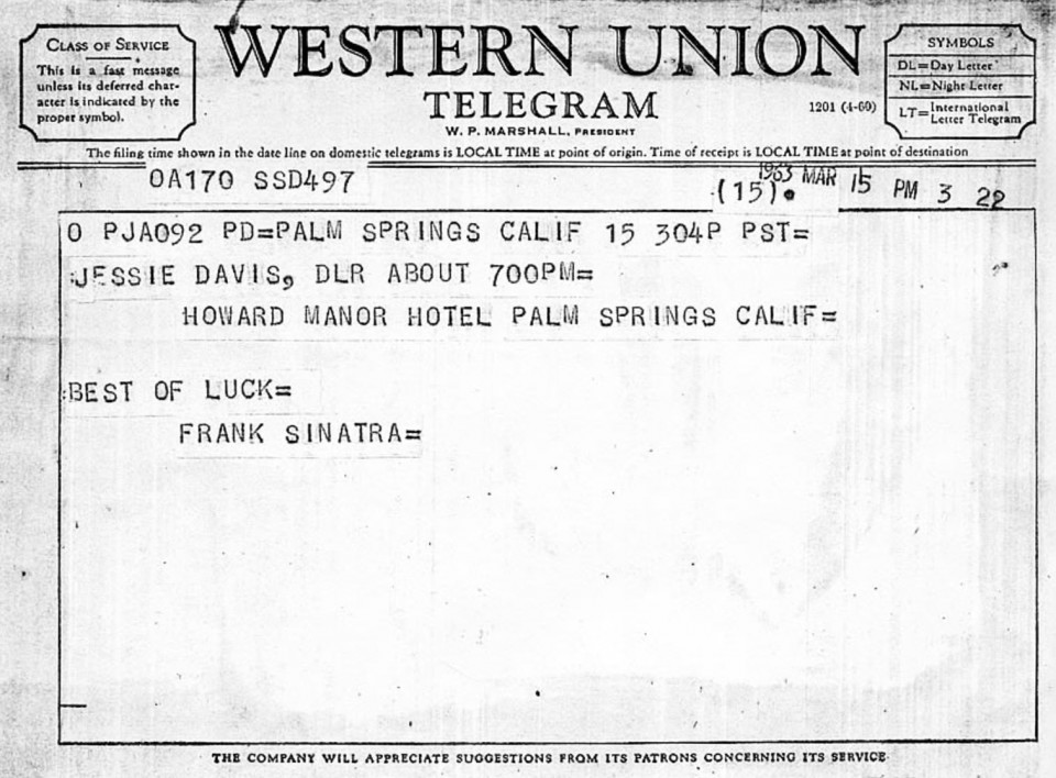 Davis sang in a variety of venues, but in 1967 he had a chance to audition for Las Vegas. “I had been performing at a large Supper Club Palm Springs called the Howard Manor,” he recalled. “A strangely dressed guy had wandered in during an afternoon rehearsal and told me, “I’m going to tell Jack about you.” I had no idea who he was talking about and mentally dismissed the comment. A week or so later, that same guy came back in to hear my show and, during a break, called me over to a wall phone and said “Here, talk to Jack.” It turned out to be Jack Entratter, the GM of the Sands Hotel and Casino. He was labeled as an owner, but I found out later that he was the GM… a powerful one.” Entratter scheduled an audition for Davis. “When I arrived I thought I would be auditioning for the manager of the Lounge. I found out maybe 15 minutes ahead of time that I would be auditioning in the huge Copa Room (Sinatra’s room), not only for Jack Entratter but also for Sinatra himself and Dean Martin’s wife! To say I was nervous doesn’t even go there… especially when I found out that they had forgotten to set up a microphone for me! But I forged ahead, thinking I had no shot of getting a gig under these circumstances and did a couple of songs. Sinatra then said to Jack (loud enough for me to hear him)… “What are you trying to do, burn the kid’s voice out? Give him a job! A Wow moment for me for sure,” Davis said, good naturedly. The audition led to many engagements at various casinos in Las Vegas, Reno, and Lake Tahoe. “Sinatra sent me a congratulations telegram on my opening night and also came in to see me on another night,” Davis said.