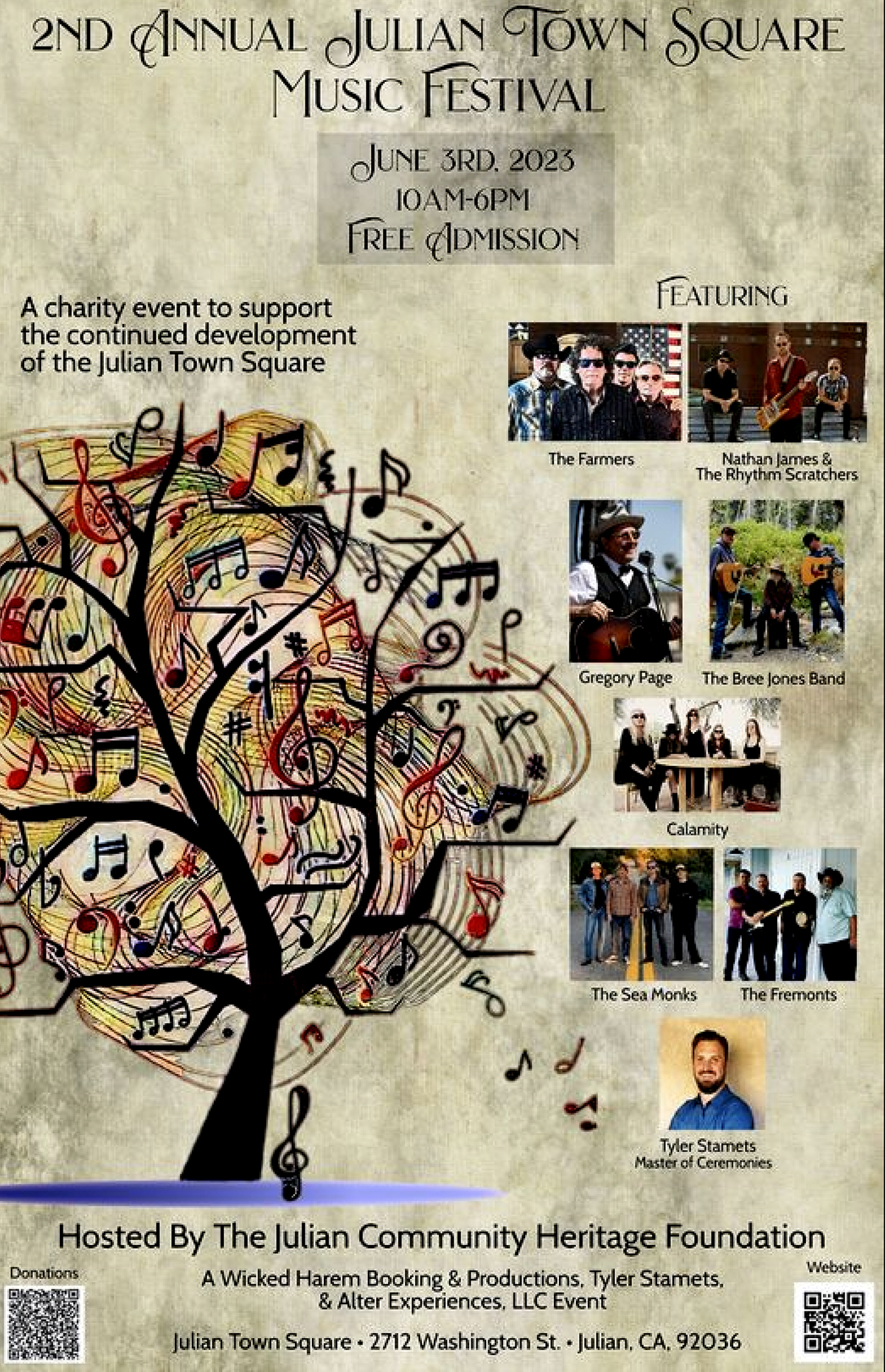 The Julian Town Square Music Festival will be held on Saturday, June 3, 10am-6pm.