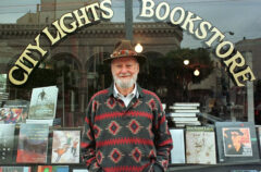 Ferlinghetti in front of his beloved City Lights Bookstore.