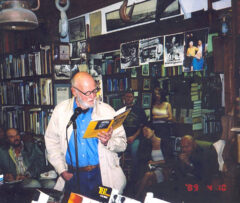 Wills was at the end of the store’s front counter and pounced on the phone before it could peal again. Ferlinghetti didn’t miss a beat. “Is this Manny’s Bar and Pool Hall?” he asked. The accent was East Coast, New York perhaps, American. The audience inside and out gave a nice laugh. Lawrence Ferlinghetti grinned and continued to read, the man who will continue to be read in bars, pool halls, bus stops, libraries, quoted in academic papers and by bus boys and waitresses.