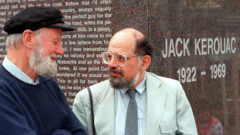Ferlinghetti and Allen Ginsberg chat in 1988 during the dedication of public art dedicated to Jack Kerouac in Lowell, Mass. AP Photo/John Chase.
