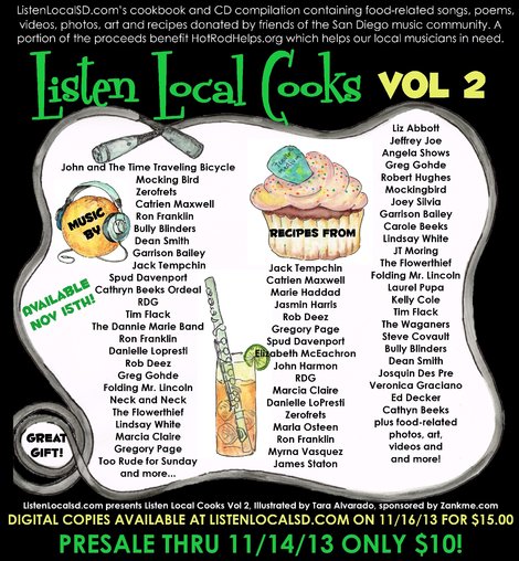 The 75 page cookbook includes art, photos, poems and stories from friends of the San Diego music community. It will be $15 for 1 download code or $20 for two. Each download code will come affixed to the CD compilation from Listen Local Cooks Vol 1 which was produced in November of 2006.