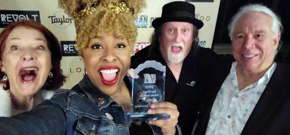Liz and her bandmates celebrate their win for Best Local Recording at the SDMAs.