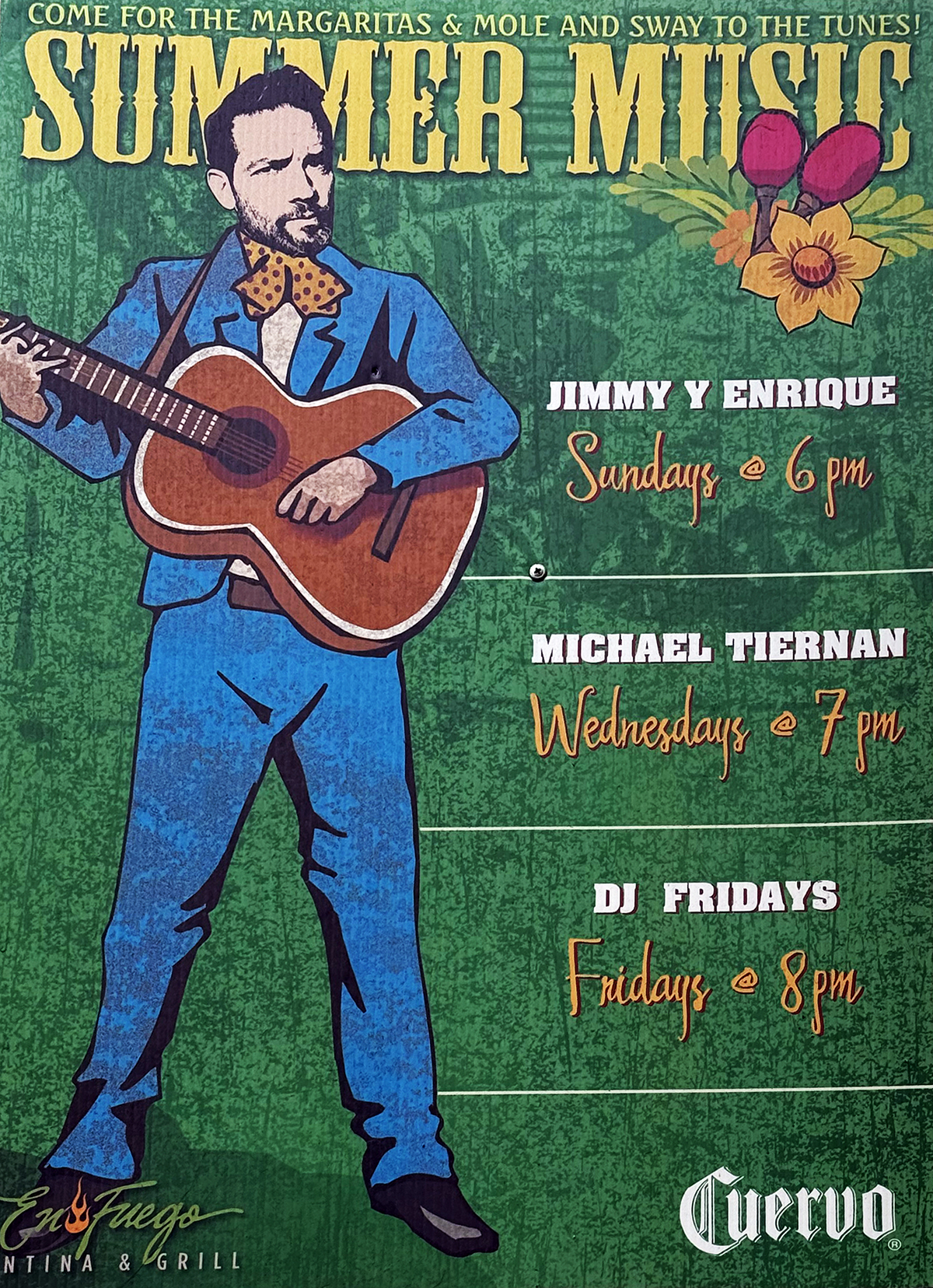 Not just at En Fuego, the Del Mar eatery, whose cool and friendly outdoor patio has been hosted every Wednesday for 18 years by singer-songwriter Michael Tiernan, 14 of those years with partner/percussionist Jeff Stasny.