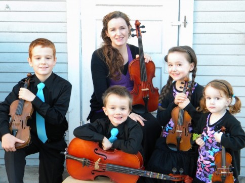 Introducing De La Motte Strings! Their members include siblings Josiah (age 10, violin), Pearl (age 8, violin), Elijah (age 6, violin), Naomi (age 4, violin), and their mother Amber (viola).