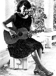 A year after Bob played at our Folk Festival, he put me in touch with Bonnie Jefferson. Bonnie was from Arkansas country or, as she put it, “out in the sticks between Little Rock and Fort Smith.” She was perhaps the most rural of the country blues artists I had run into, doing old songs like “Take Me Back” and “Real Black Mare.” She was also shy and fearful that her welfare money would be cut off if, since it was thought she was making lots of money singing the blues. Often, when I’d get a date for her to play, she’d insist on working under a different name (many times we called her Lu Lewis). We did get her a National Endowment for the Arts grant to buy her a new guitar, but she never did much with it. Bonnie appeared at several festivals as well as concerts at my store and made a handful of recordings (most of them never issued).