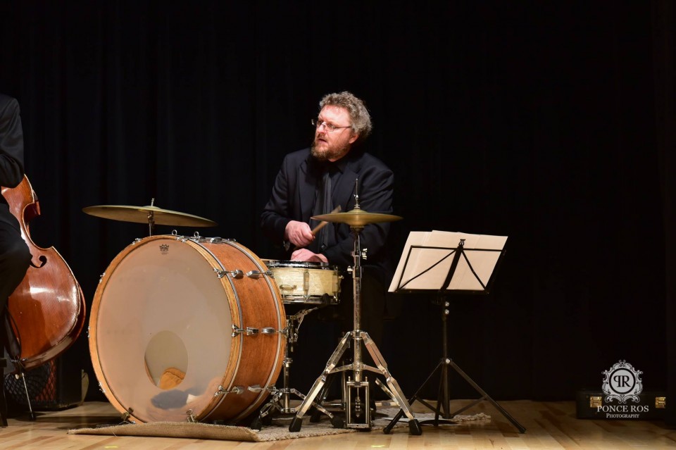 Hubbard also plays orchestral percussion. He was trained in that genre by mentors like Pat Pfiffner at Palomar College and Danlee Mitchell at San Diego State. Most often it’s vibraphone and marimba, with occasionally tympani. All of these skills come in handy when Hubbard works in musical theater around town, a pursuit he engages in several times a year, often for weeks at a time.