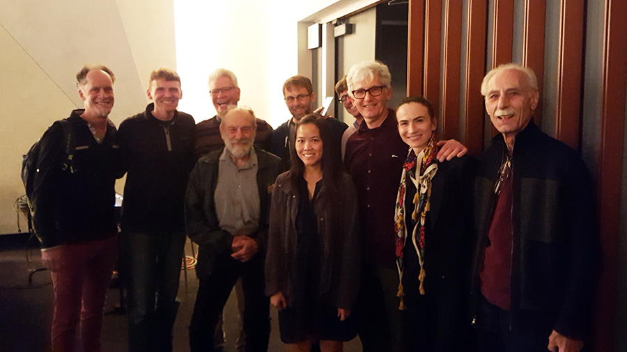 Bassists Rob Thorsen, Justin Grinnell, Bob Magnusson, Mark Dresser, and others at a Gary Peacock Trio concert in 2016. Photo courtesy of Justin Grinnell.