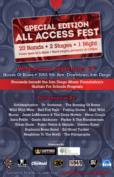 On Wednesday, September 17th, fans can enjoy a special San Diego Music Awards edition of All Access Fest , featuring 20 SDMA-nominated bands. Acts on the bill include Jesse LaMonaca & the Dime Novels, Gayle Skidmore, Sara Petite, Patric Petrie & Skelpin, Euphoria Brass Band and more.  The 21+ event is FREE with a ticket from any of the performing bands or from your favorite radio stations. Tickets can also be purchased in advance online or at the door the day of the event. Doors open at 5:30  with the first band starting at 6pm. Proceeds from the event will benefit San Diego Music Foundation’s “Guitars for Schools” program.