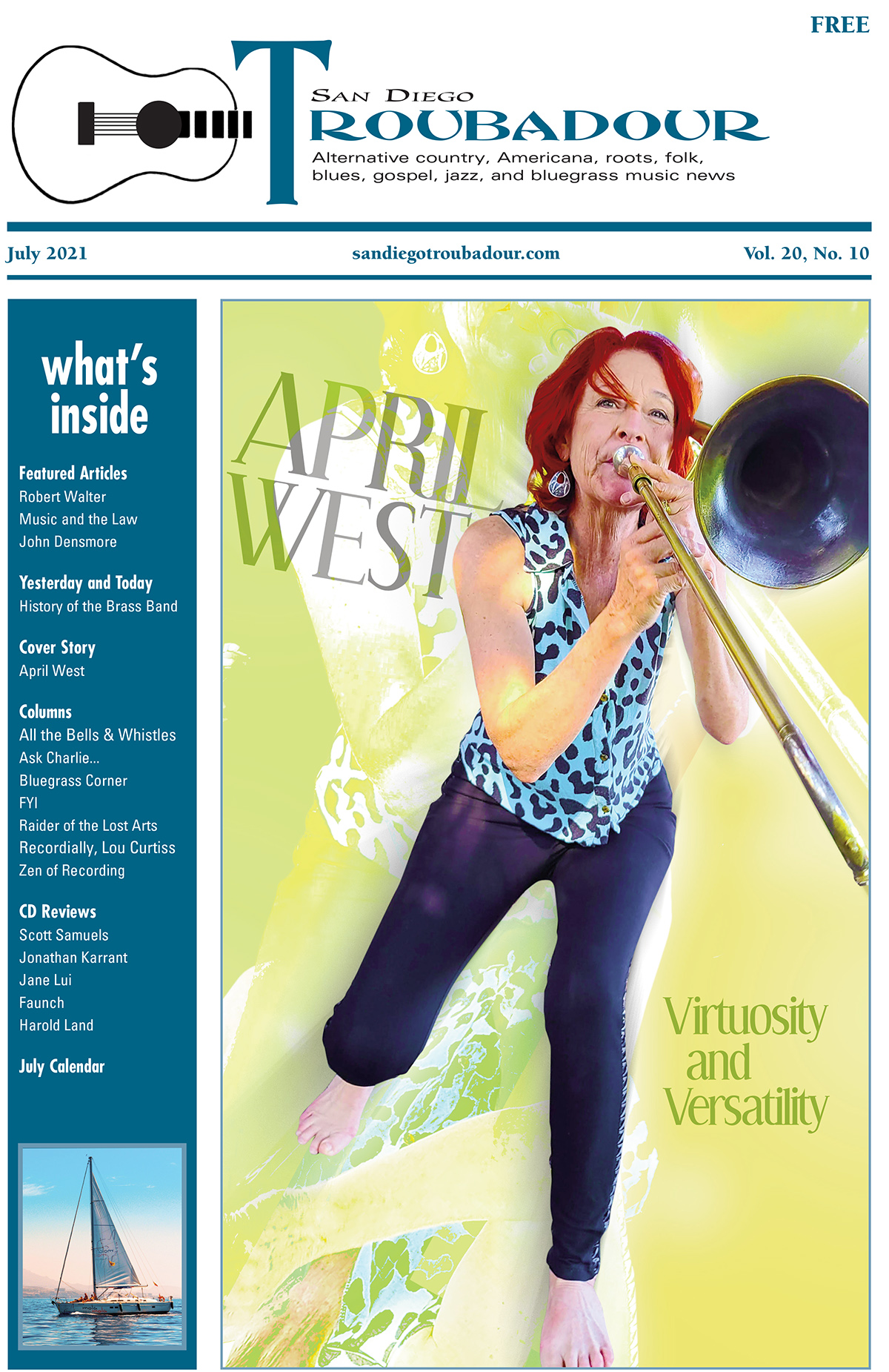 April West on the cover of the San Diego Troubadour, 2021. Photo by Julia Hall McMahon.