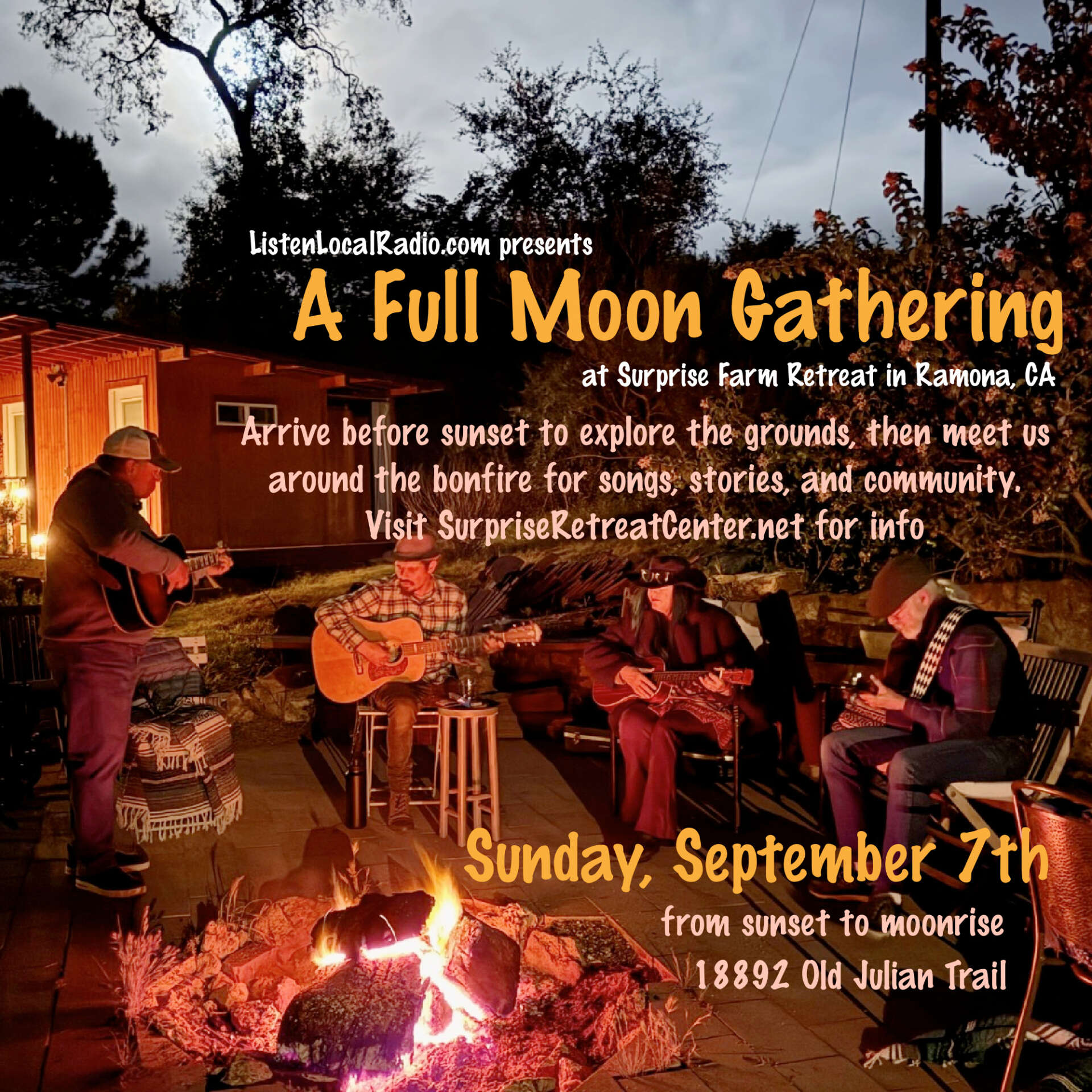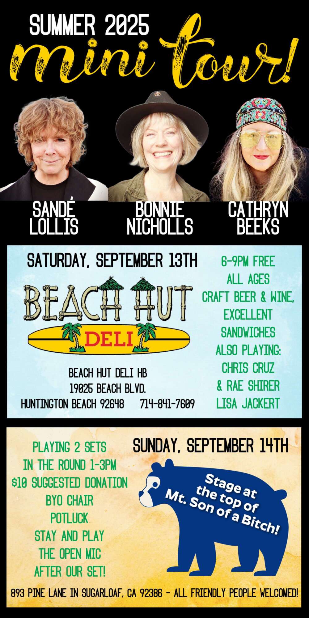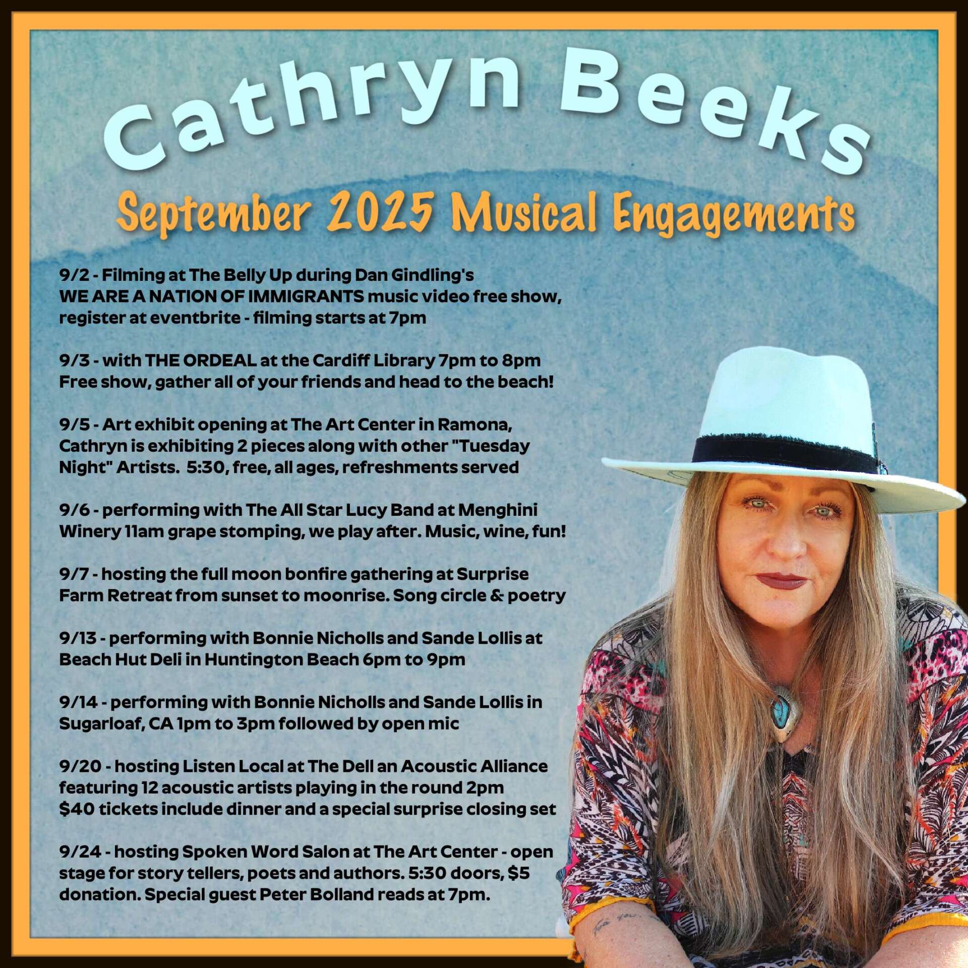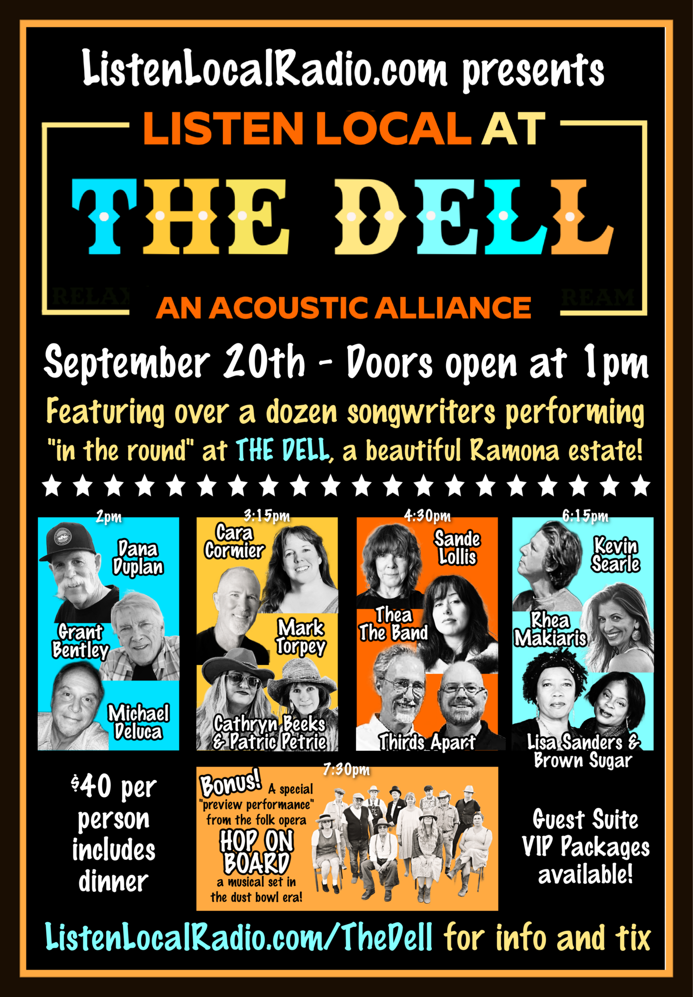 Ok, so back to THE ACOUSTIC ALLIANCE at The Dell. The Dell is an incredible event space/home in Ramona located right next door to Hatfield Winery. It has views, a pool, jacuzzi, 4 bedrooms and a kitchen to die for. Old California style, comfy, elegant… The Dell has it all, Take a tour! On Saturday, September 20th doors will open at 1pm so you can spend an hour enjoying The Dell before the show starts. At 2pm the first set of 3 songwriters will take the stage: Michael Deluca, Grant Bentley and Dana Duplan. They’ll rotate the spotlight and present 4 songs each. At 3pm their set will conclude and we’ll take a short break to get the next 3 set up: Rhea Makiaris, Cara Cormier and Mark Torpey. At 4:30 Set 3 features Thea Tochihara, Sande Lollis and Thirds Apart. At 5:30 we’ll break for dinner, pork sliders, coleslaw and beans served by our gracious hosts James and Rath, then we’ll present set 4 with Lisa Sanders, Kevin Searle and myself with Patric Petrie. I know the poster says I go on earlier but Rhea Makiaris was offered a great gig that night so she requested I switch places with her, which I agreed to do b/c I love that girl! 😉 Then? The final set will be a few songs from the folk opera musical HOP ON BOARD and you’re NOT gonna wanna miss that!! Ok, so. This is a seated, listening room environment and tickets are $40 per person which include dinner. There is 1 room remaining if you’d like to stay the night with us (we’ll have an after party jam on the patio under the stars with all of our overnight guests!). The Barona Room is available for $200 which includes 2 tickets to the show and dinner. If you’d like to purchase tickets you can do so via Venmo, Paypal or Zelle by visiting this link. This is going to be a super sweet event made even sweeter by your attendance!