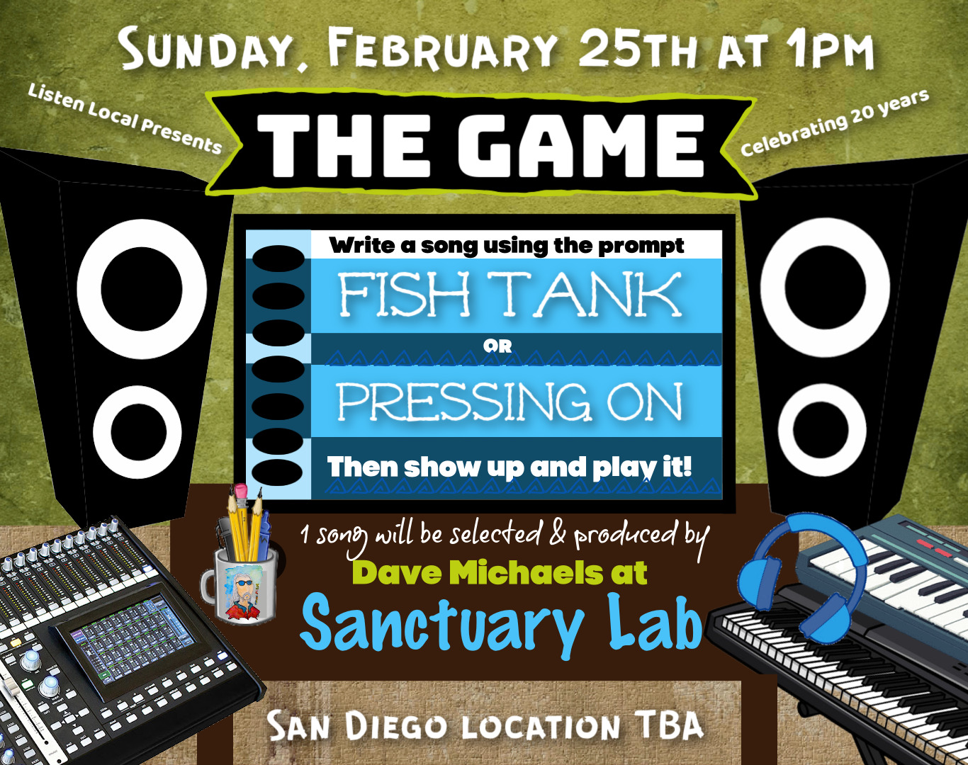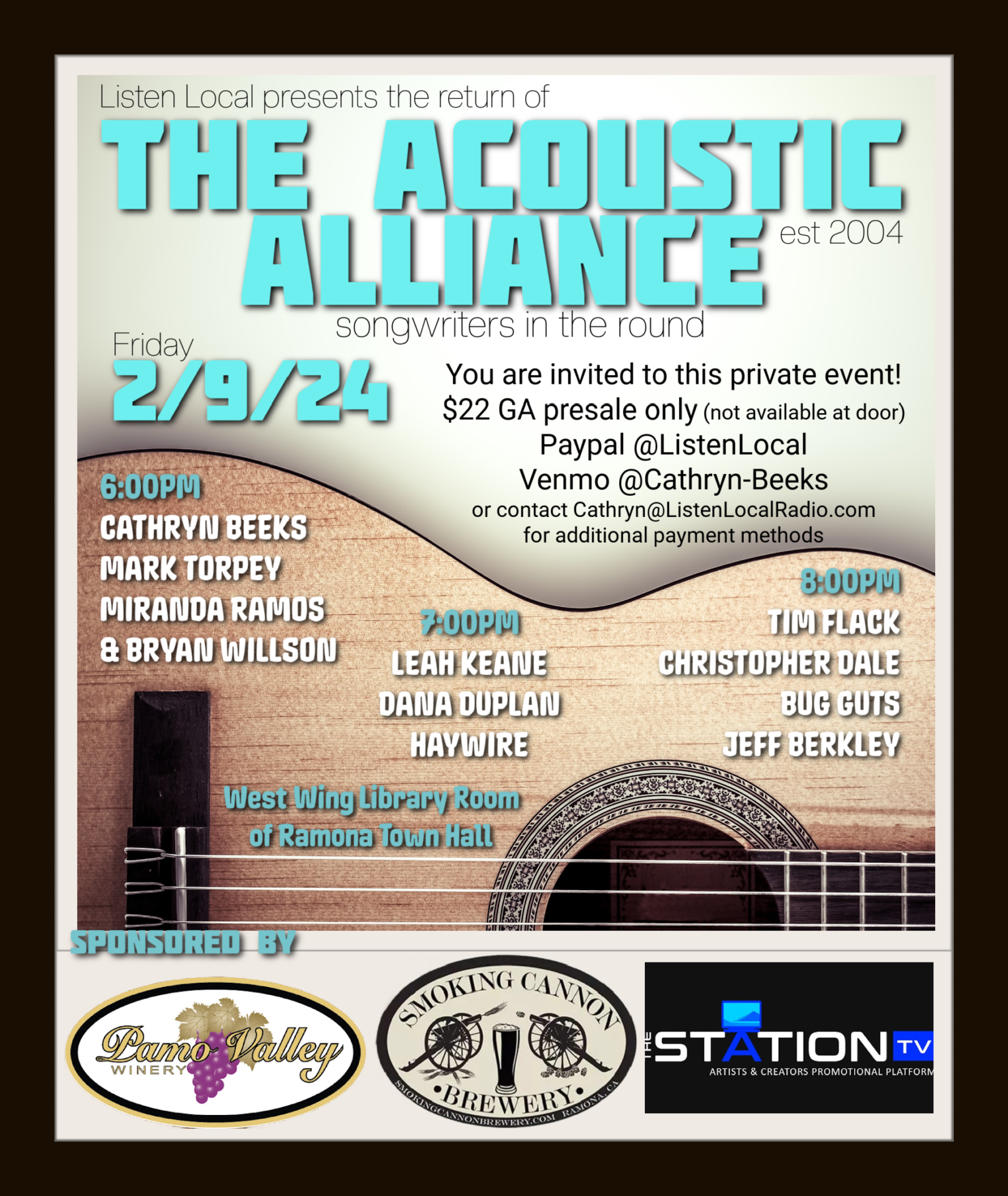 In between sets you can meet and chat with your favorites over by the merch table where you can purchase their wares. Additionally, I’ll be offering my famous Vegetarian Chili and Grilled Cheese sammies and the lovely folks from Smoking Cannon Brewery and Pamo Winery are sponsoring our event, offering delicious and award-winning beer and wine. Tickets are $22 and MUST BE PURCHASED PRIOR TO FEBRUARY 9TH as this is a “private” event so that we can offer food and drinks to our guests. Sorry, NO TICKETS WILL BE SOLD AT THE DOOR. Ticket info is on the poster and if you don’t do digital, you can always reach out to me for alternative payment methods at Cathryn@ListenLocalRadio.com. Learn more about The Acoustic Alliance, peep videos from the past and check out the Alumni list at ListenLocalRadio.com/AAAlumni and here are some photos by Steve Covault from over the years. Another anniversary? Yes. We were dang busy in 2004. THE GAME is also celebrating 20 years of good times this month with a special event, location TBA, on February 25th. Do what the poster says and stay tuned to The Game | ListenLocalradio.com for location information. Here’s the rest of what’s doing in February. I can’t express to you how much fun we have at our song circles, bring your pick’n chair and instrument and join us for some fun up here in Ramona! If you like a more intimate experience, I’ll be singing to you table side at Ramona Ranch Winery on February 19th and HOPEFULLY you have the day off to come up and enjoy some spectacular views!