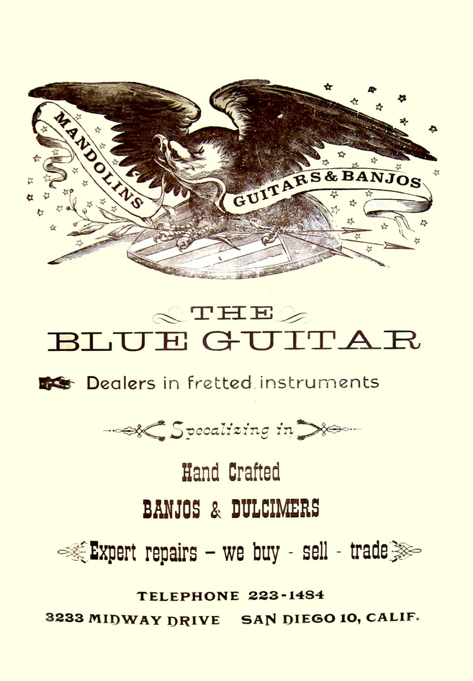 The Blue Guitar, which first opened in 1961 by Ed Douglas and Yuris Zeltins, will be closing its doors on February 14. In its long and illustrious history, the store gave birth to one of San Diego’s first bluegrass bands, the Scottsville Squirrel Barkers, which included Ed Douglas, Chris Hillman, Bernie Leadon, Larry Murray, and Kenny Wertz. The focus on the Blue Guitar has always been about repair, with customers that have included George Harrison, David Lindley, and Jackson Browne among others. It’s the end of an era and we’ll be sad to see them go. There a giant sale going on until they close. To give our readers a little background on the store, here is a reprint of a Troubadour article from August 2007.