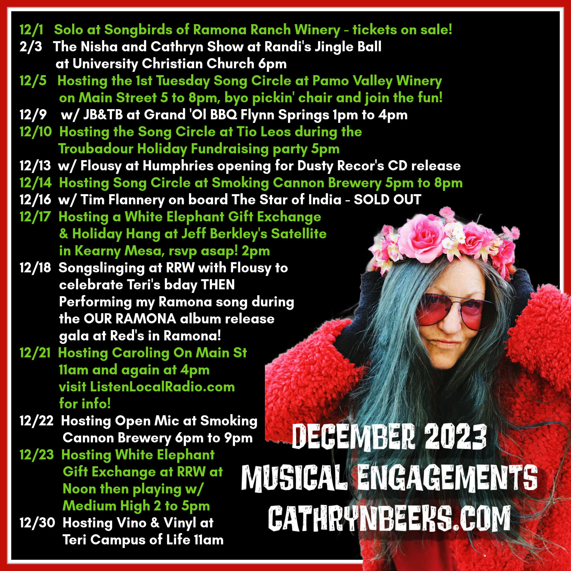 I’m also hosting a “Ramona Edition” exchange at Ramona Ranch Winery on December 23rd at high noon. There is a beautiful patio or gorgeous tasting room so no matter the weather, we’ll be covered, and the view is otherworldly. We’ll start this exchange promptly at 12:15 so don’t be late! Medium High will be performing from 2pm to 5pm directly after the exchange. Any questions? Give me a shout! Cathryn@ListenLocalRadio.com