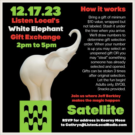 After a few years of hiatus, the Listen Local White Elephant Gift Exchange is back. I’ll be hosting two very fun and festive events this season. The first one will take place at Satellite, the studio in Kearny Mesa where Jeff Berkley makes his magic. This exchange will be on Sunday, December 17th from 2pm to 5pm. RSVP to Cathryn@ListenLocalRadio.com by December 16th! Get there before 3pm to get in on the exchange. BYO beverages, I’ll have a chilicuterie board so come hungry, donations appreciated! Bring a wrapped gift with no label of approx. $10 value and stash it under the tree when you arrive. At 3pm sharp (sorry, no gifts accepted after 2:55pm) we’ll draw numbers.