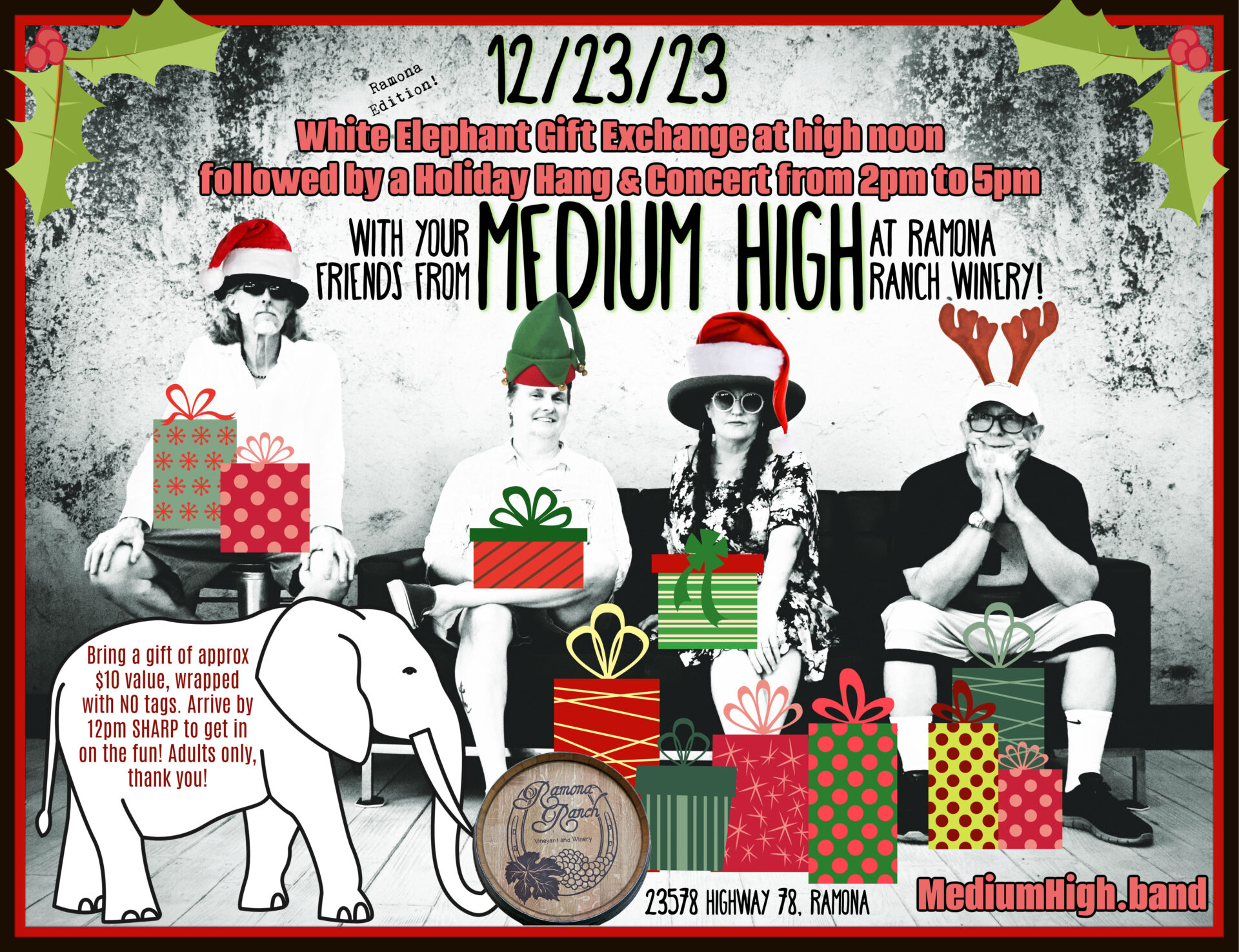 I’m also hosting a “Ramona Edition” exchange at Ramona Ranch Winery on December 23rd at high noon. There is a beautiful patio or gorgeous tasting room so no matter the weather, we’ll be covered, and the view is otherworldly. We’ll start this exchange promptly at 12:15 so don’t be late! Medium High will be performing from 2pm to 5pm directly after the exchange. Any questions? Give me a shout! Cathryn@ListenLocalRadio.com