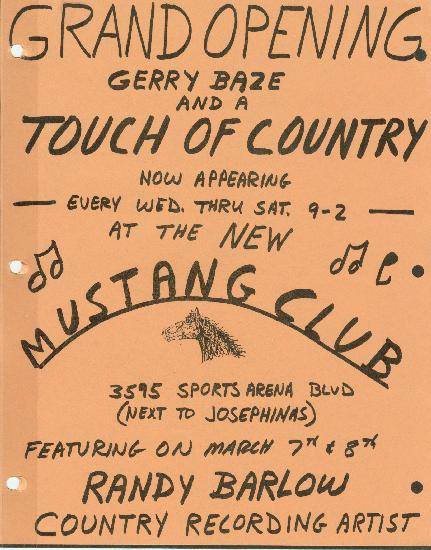 The year was 1980 when the movie Urban Cowboy was a box office smash hit. Club owners took full advantage of the movie’s mass appeal, which led to suburbanites and yuppies packing clubs to line dance, two step, and ride mechanical bulls. Hence, on March 7, 1980, the Mustang Club had its grand opening, featuring a five-piece house band, A Touch of Country, in addition to a special set by 1979 Country Music Association Award (CMA) nominee for Best New Male Vocalist, Randy Barlow.