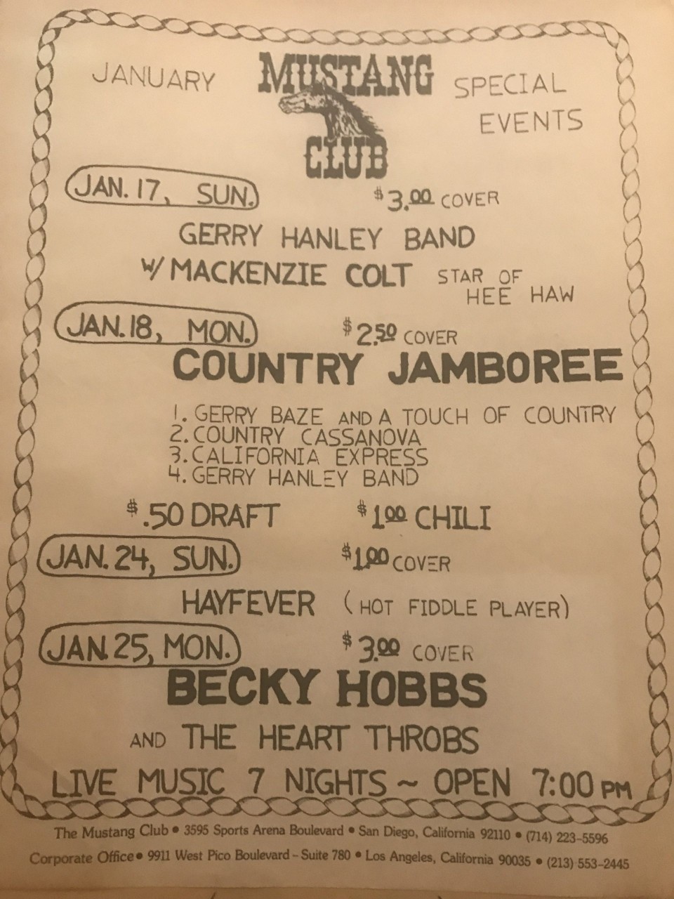 On your next trip to the Home Depot on Sports Arena Boulevard, take a glance over to the northwest corner of the parking lot where once stood the Mustang Club at 3595 Sports Arena Boulevard, a legendary country music hotspot that featured many top local artists and performances by a slew of national treasures, including Alabama, Hank Williams Jr., Lacy J. Dalton, Randy Barlow, and Becky Hobbs to name a few. What is now a square block area of thrift stores and swap meets and a haven for many of the homeless tucked away in sleeping bags and ambling around in rickety shopping carts, was once the Bermuda Triangle of entertainment. Directly across the street was the San Diego Sports Arena where you could take in an NBA or San Diego State basketball game, then stroll back across the street to the Tower Records store, open until midnight. Adjacent to Tower Records was Foggy Notions bar, a popular hang for beer and air guitar contests.