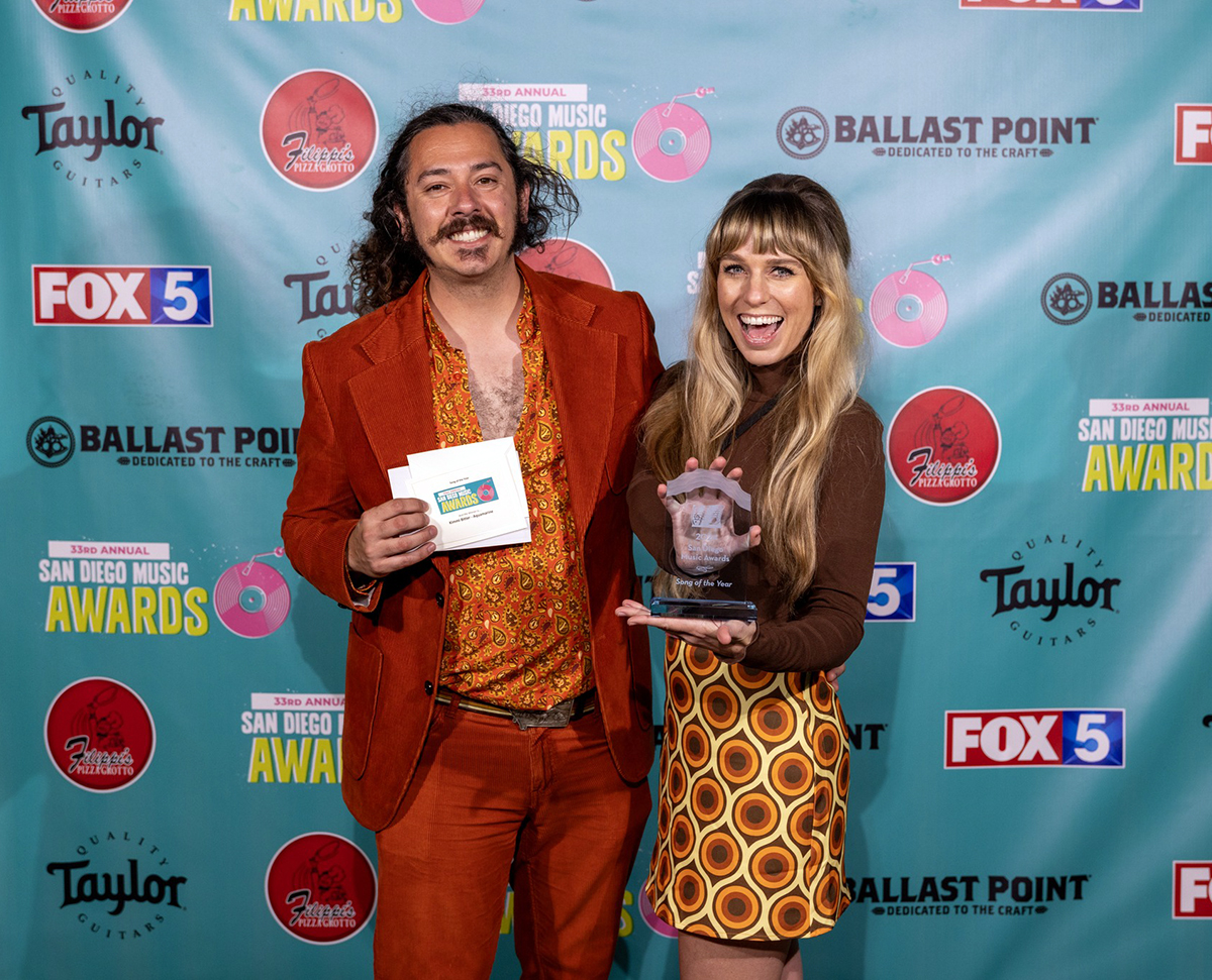 LL: I remember the San Diego Music Awards a couple of years ago—the first award of the night. You won, and I saw you two sprinting from the entrance to the stage. We were all shouting, “She’s here!!” You had just arrived right on time. It was incredible.