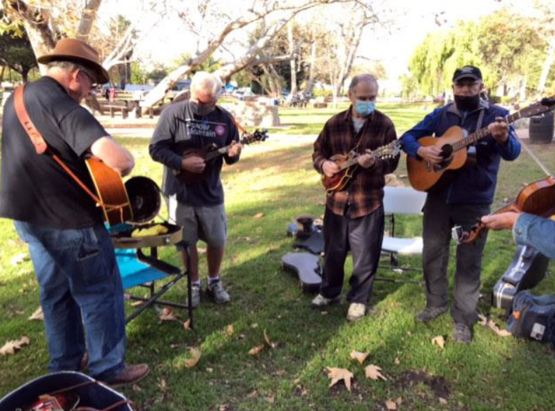 Bluegrass Jam in Poway. While bluegrass concerts and jam session are mainly closed due to the corona virus, we note the glow of an ember in Poway. There is a small, limited attendance, regular group meeting. These jam sessions are outdoors and follow safety protocols. It gives us hope that soon we may see more of these kinds of gatherings returning as our region as we roll out the corona virus vaccine and start to control the corona virus pandemic. In the meantime, stay safe!