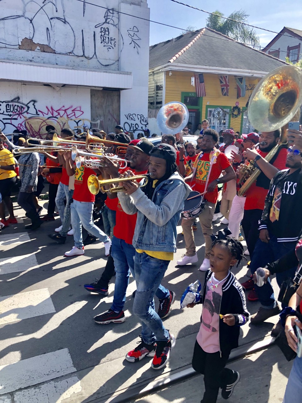The vernacular of New Orleans brass bands originally comes from Congo Square and is informed by the music, clave/time feel and percussion of West and Central Africa. The repertoire was originally spirituals and hymns  (“Closer Walk with Thee,” “I’ll Fly Away” et. al.) and call-and-response work songs. The experience of the second line in a memorial or celebration is what has shaped the repertoire of the music and the personnel of the band. The music is spiritual in a way that is subtly different than playing music through electronics, i.e., guitars, keyboards, and synths. The sounds come right out of the viscera of the body. The dancing that is paired with it is known as buckjumping, which requires its own essay to understand fully. Be sure to catch Buckjumping (a documentary from 2018). I dare any professional dancer or ironman athlete to roll on a four to five-hour second line through the streets of New Orleans and see if they can keep up with the local buckjumpers Several of my bands from San Diego have made the pilgrimage to Nola and all have experienced or performed in a parade. It truly moves you, changes your perspective, and makes you reconsider your whole way of life.