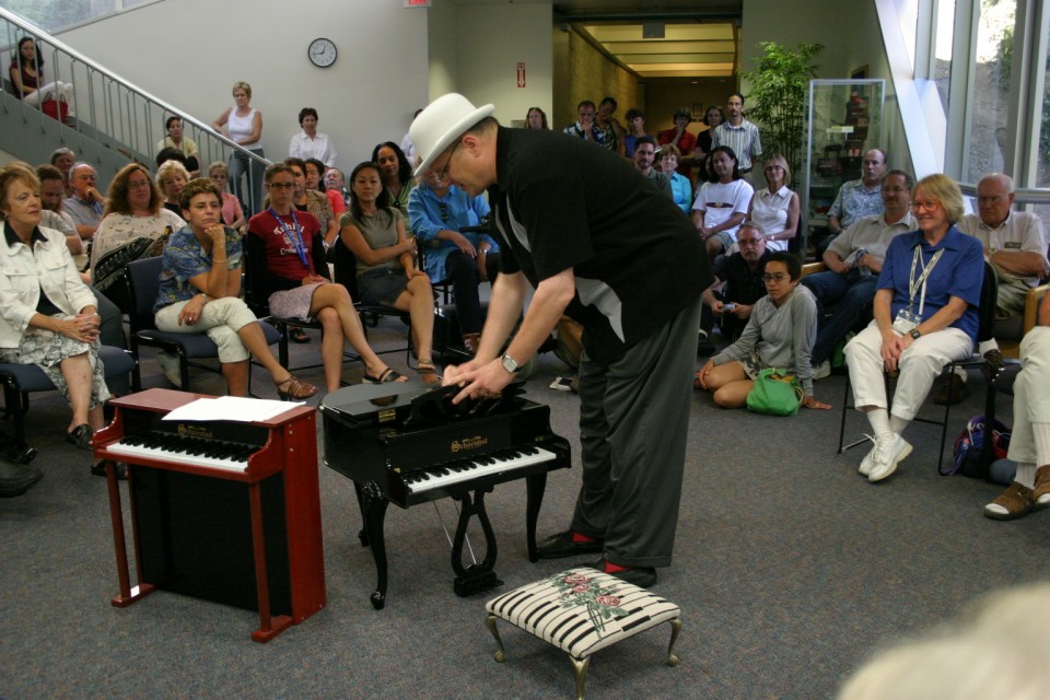 In 1999, a missing service bell at a Geisel Library Help Desk spawned a long streak of toy piano activity on the UCSD campus. I hurriedly replaced the missing service bell with a playful tiny keyboard and a sign that read: “Please play on toy piano for service.” And play they did! This surge of musical activity from visitors was the inspiration to host our Annual Toy Piano Festival.