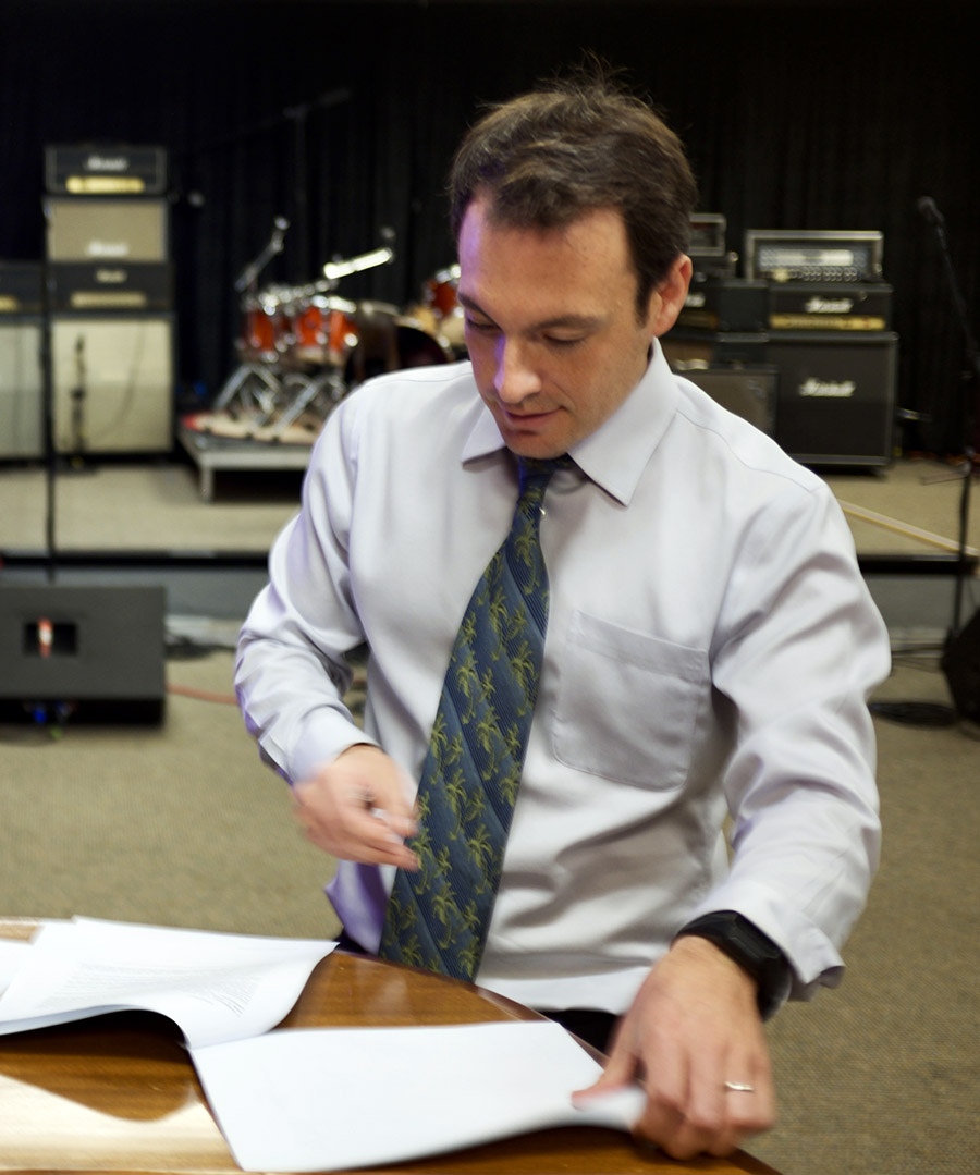 Brian Witkin signing paperwork in the studio.