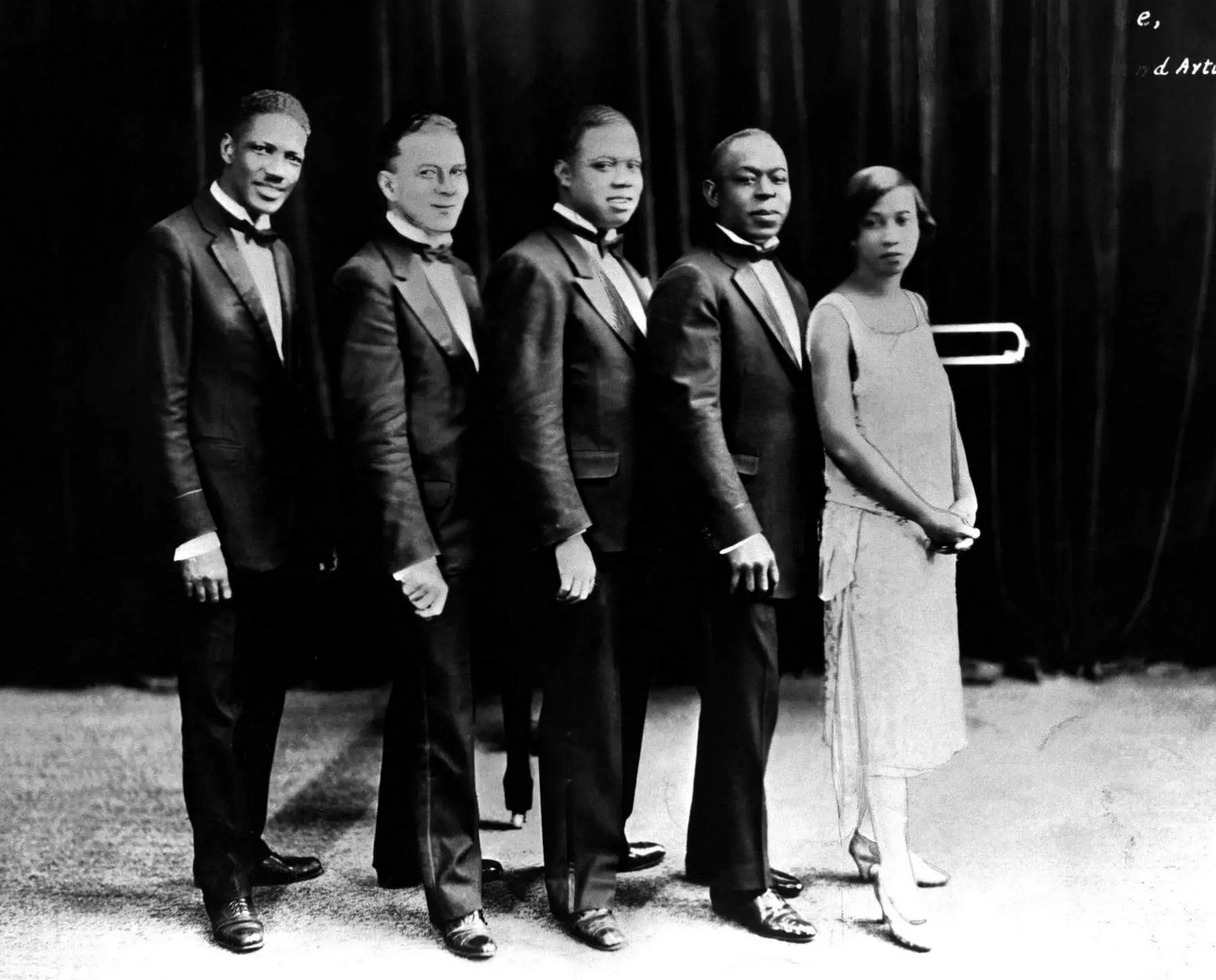 Louis Armstrong and his Hot Five, ca. 1924: Johnny St. Cyr, Kid Ory, Louis Armstrong, Johnny Dodds, Lil Hardin-Armstrong.